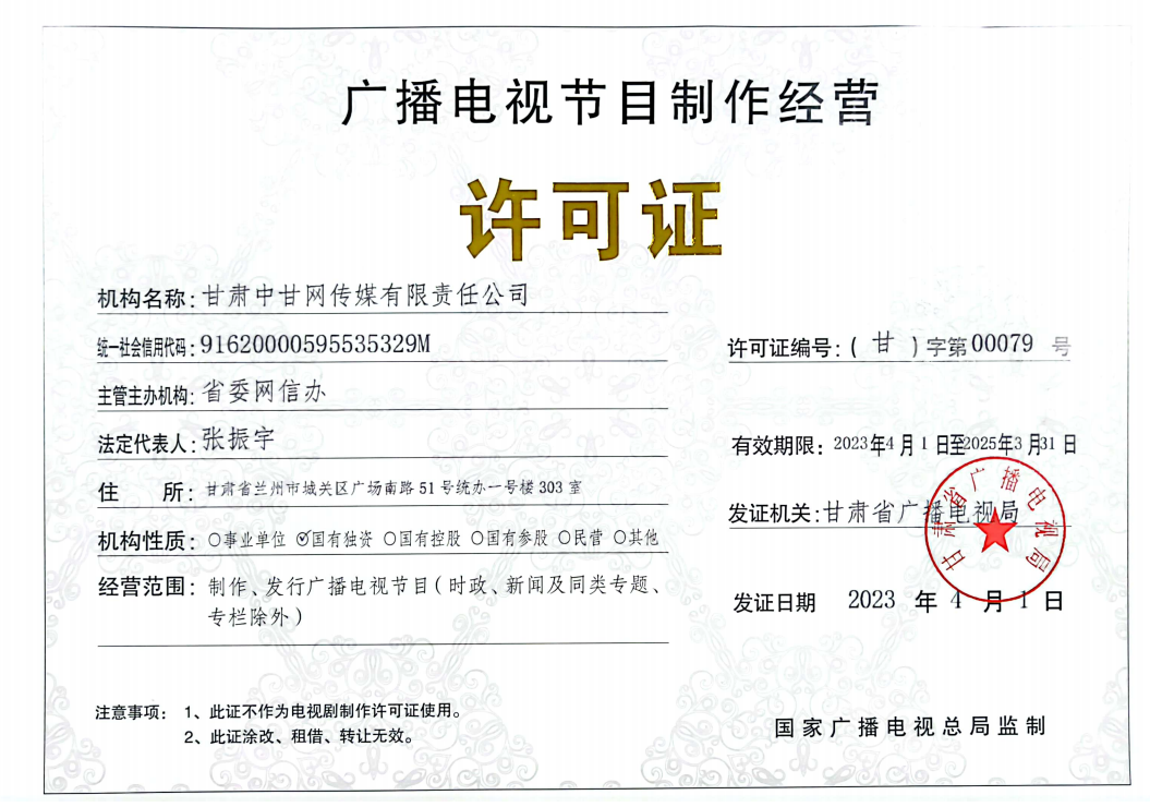 廣播電視節(jié)目制作經(jīng)營(yíng)許可(甘)字第00079號(hào) 增值電信業(yè)務(wù)許可證號(hào)甘B2__20120010 經(jīng)營(yíng)許可證號(hào)甘B2-20060006