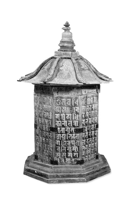 西夏木緣塔為西夏墓葬中第一次發(fā)現(xiàn)的西夏葬器。該塔通高75厘米,塔頂邊沿寬47厘米,呈四層八角形,飾紅色;分塔座、塔身、塔頂和塔剎四部分。塔座為四級(jí)八邊臺(tái)階。塔身為八邊柱體形,由長34厘米、寬12.5厘米、厚2厘米的八塊木板合成,表面涂藍(lán)色,每邊有黃色工整梵文“陀羅尼”,并用漢文注明陀羅尼經(jīng)名。塔頂為傘式八邊形,每邊彩繪云氣紋和一個(gè)梵文字,內(nèi)有墨書“故考任西經(jīng)略司都案劉德仁,壽六旬有八,于天慶五年歲次戊午四月十六日亡歿,至天慶七年歲次庚辰(申)口夏十五日建緣塔,至中秋十三日入課訖”。塔剎圍欄為八邊形,其他相輪、覆缽、剎頂都是圓形,由下向上收分;底座周圍繪有卷草紋。