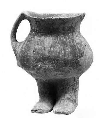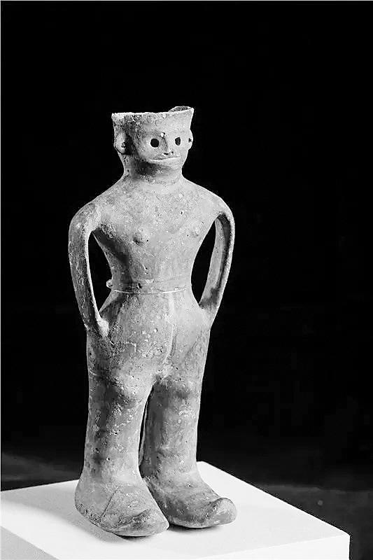 最特別的就是他雙腳上的鞋子,看上去完全是一雙高腰靴子,而且腳型巨大。陶器人體中空,可以盛水,插入褲兜的雙臂形成陶罐的雙耳,設(shè)計十分大膽精巧。