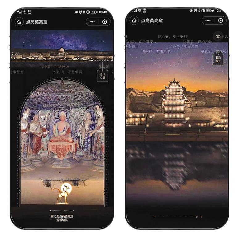 為了感受千年前莫高窟的燃燈民俗,記者迫不及待地體驗(yàn)了一把:進(jìn)入“云游敦煌”官方小程序,通過“點(diǎn)亮莫高窟”入口,即可欣賞星空下的莫高窟全景,并與萬千用戶一起“點(diǎn)亮”崖體上的洞窟。隨著用戶點(diǎn)亮人次增多,畫面中燈光的亮度也隨之增加。至深夜時(shí)分,用戶將會(huì)看到莫高窟崖體上空“銀河”與洞窟光亮相映成輝的景象,體驗(yàn)千年前莫高窟燃燈盛況。“點(diǎn)亮莫高窟”的創(chuàng)意來自于敦煌文獻(xiàn)中記載的場(chǎng)景,莫高窟燃燈是敦煌歲時(shí)民俗。據(jù)記載,每逢特定的時(shí)間,當(dāng)?shù)孛癖姇?huì)在莫高窟舉行盛大的燃燈活動(dòng),于窟龕點(diǎn)亮燈盞。總燈數(shù)可高達(dá)700余盞。