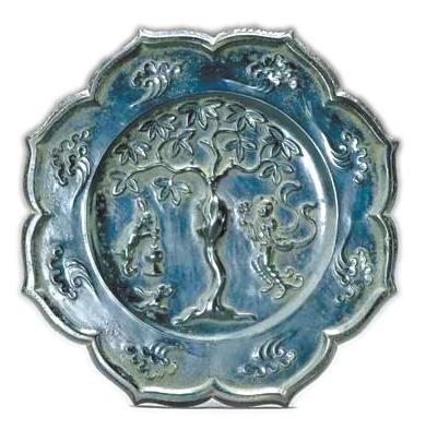 除此以外,以兔為紋的文物也很常見。藏于故宮博物院的唐代八瓣菱花形月宮鏡頗有特色。由于唐以前銅鏡多為圓形或方形,唐代才開始流行花式鏡,因此,菱花形為其中最具特色者。其背面內(nèi)區(qū)下凹,紋飾凸雕月宮圖,中央為枝繁葉茂的桂樹,樹干中部隆起鏤空為鏡鈕。一側(cè)為嫦娥振袖起舞,另一側(cè)為白兔搗藥,下有蟾蜍做跳躍狀。