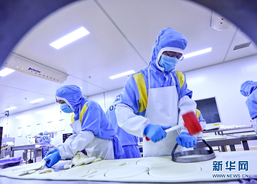 9月9日,甘肅省張掖市甘州區(qū)一月餅加工車間內,工作人員正忙碌制作中秋“土月餅”。新華網發(fā) (王將 攝)