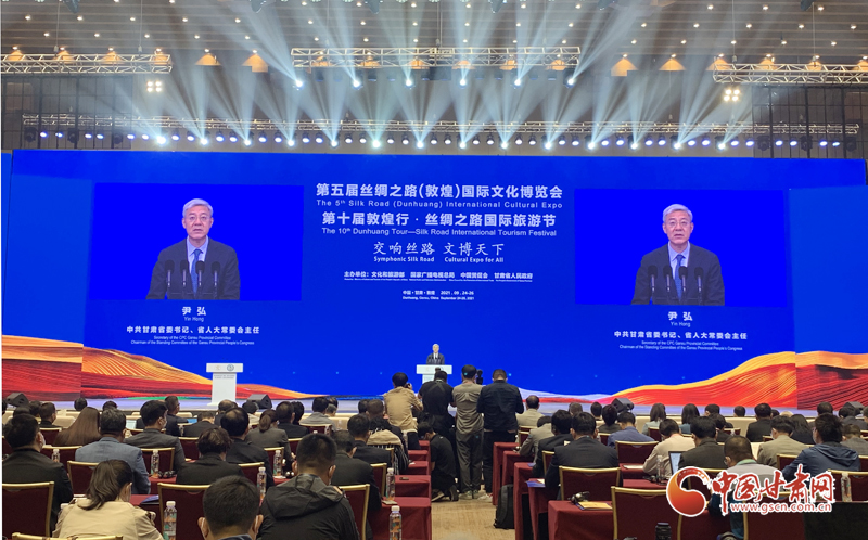 中國甘肅網9月24日訊(本網記者  宋芳科 楊亞楠 張振國)9月24日上午,第五屆絲綢之路(敦煌)國際文化博覽會和第十屆敦煌行·絲綢之路國際旅游節(jié)開幕。本屆“一會一節(jié)”由文化和旅游部、國家廣播電視總局、中國國際貿易促進委員會、甘肅省人民政府共同主辦,以“交響絲路 文博天下”為主題,旨在進一步加強“一帶一路”人文交流的官方合作和民間往來,增進共建“一帶一路”國家的文化認同。中共中央政治局委員、中央書記處書記、中宣部部長黃坤明以視頻方式發(fā)表主旨演講。