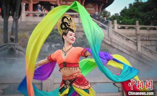 敦煌舞舞蹈演員時而翻轉琵琶,時而揮動彩綢,在氤氳的霧氣映襯下宛如在仙境起舞?!「拭C省文化和旅游廳供圖