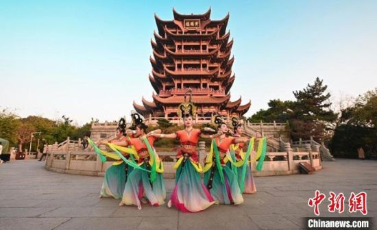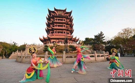 11月27日,伴著幽幽古樂,“飛天仙子”在“江南三大名樓”之一的黃鶴樓前演繹敦煌舞?!「拭C省文化和旅游廳供圖