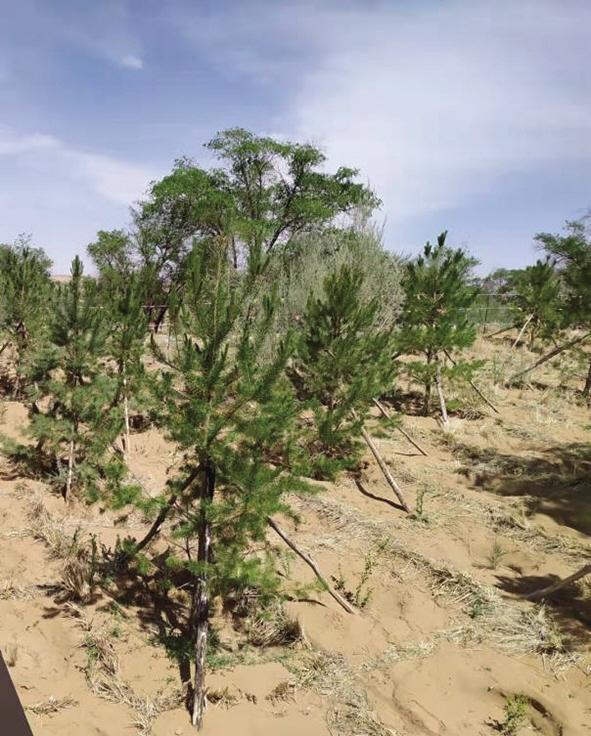 我和同伴撲進(jìn)沙海柔軟的懷抱。認(rèn)識(shí)到,再小的沙粒,也不能與塵世隔絕,我與沙,結(jié)緣于此。沙海里,一沙一世界。黃沙大膽赤裸地暴露在天幕蒼芎下,以大,以小,涵納無窮。“沙沙”的足音里,印下我深深淺淺兩行腳印,宣告著浪漫與踏實(shí)的存在。我來到習(xí)近平總書記親手栽植的“五棵松”下,仰視青松,綠云葳蕤,生機(jī)勃勃。總書記的關(guān)懷和鼓勵(lì),黃沙熱熱地、輕輕地長(zhǎng)出了更多綠色羽翼,這羽翼在不斷地生長(zhǎng)壯大,有“代代相傳”的精神,綠色終究會(huì)覆蓋全部騰格里。捧起一捧黃沙,細(xì)沙像嬰兒肌膚般的柔滑,我試圖用臉貼近它,這些黃色的小精靈,從我指縫間輕盈地流淌到松下,似乎在暗示我,要把自己的夢(mèng)筑進(jìn)治沙精神的瀚海里??茖W(xué)家們已作出結(jié)論:沙漠是人類最后的寶地,別看它現(xiàn)在荒蕪,它里面蘊(yùn)藏著無盡的寶藏和財(cái)富。