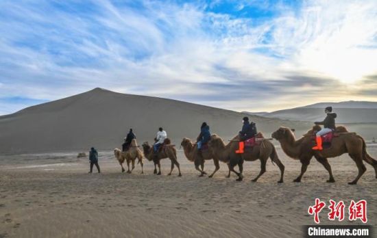新年伊始,游客在敦煌鳴沙山騎駱駝欣賞大漠風光?!⊥醣筱y 攝