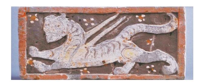 通過彩繪磚可見,這只白虎昂首,張口作怒嘯狀,雙翼挺出,身飾虎斑紋,曲尾上揚(yáng),四肢騰躍。四周點(diǎn)綴四瓣白葉花,花心點(diǎn)橘紅色。