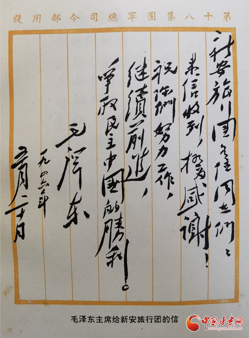 1946年5月20日,毛澤東主席給新旅回信:“新安旅行團各位同志們:來信收到,極為感謝!祝你們努力工作,繼續(xù)前進,爭取民主中國的勝利。”時隔75年后的2021年5月30日,習近平總書記給新安小學的少先隊員們回信:“當年,在黨的關懷和領導下,‘新安旅行團’不怕艱苦,足跡遍及大半個中國,以文藝為武器,喚起民眾抗日救亡,宣傳黨的主張,展現(xiàn)了愛國奮進的精神風貌。希望你們結合自身成長實際學好黨史,以英雄模范人物為榜樣,從小堅定聽黨話、跟黨走的決心,刻苦學習,樹立理想,砥礪品格,增長本領,努力實現(xiàn)德智體美勞全面發(fā)展。”