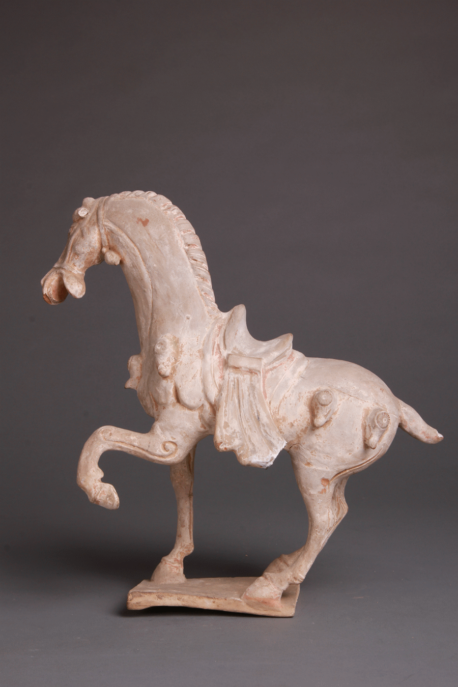 甘肅省天水市博物館收藏的這件瑰寶——唐代陶舞馬,三足立于平板之上,左前蹄屈曲,搖頭擺尾,張口嘶鳴,做舞蹈之狀。其姿勢優(yōu)雅、神態(tài)鮮活。