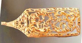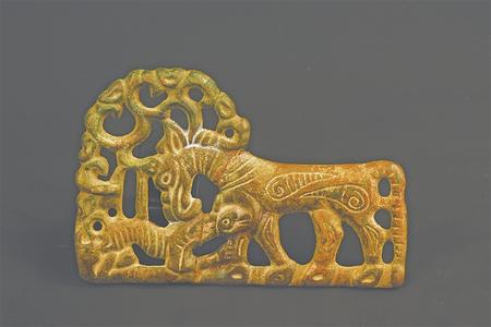 受草原文化影響,虎的造型更具藝術性,形式亦豐富多彩。甘肅省博物館藏的西周虎紋耳形銅鉞,整體似半環(huán),鑄猛虎紋,虎背為刃。尾下有短胡兩穿,尾、雙爪上鑄凹槽,虎首下彎,張口含銎,露牙睜目,領內(nèi)有一圓形穿孔。甘肅省文物考古研究所藏的戰(zhàn)國金帶鉤,鉤首為長頸龍首狀,頸部為三棱狀,肩部三角形邊框內(nèi)鏤空雕鑄對稱和狼形圖案。鉤身為長方形,邊框內(nèi)鏤空雕刻一組正反相對稱的虎噬大角羊圖案。張家川回族自治縣博物館藏的戰(zhàn)國晚期的虎形金飾片,虎尖耳上翹,大嘴張開,鬃毛卷曲上翹,尾前卷于背部與鬃毛相連,四足著地做行走狀,栩栩如生地展現(xiàn)了虎行走的動感之態(tài)。甘肅省博物館藏的戰(zhàn)國虎噬羊紋金飾片,虎張口露齒,垂首蹲踞,虎口銜羊,前爪按住羊肩部,后爪抓住羊臀部,羊四肢跪地作掙扎狀,活靈活現(xiàn)地展現(xiàn)出猛虎捕食羊的瞬間動態(tài),形象逼真。這些虎文物都是此次展覽中的亮點。