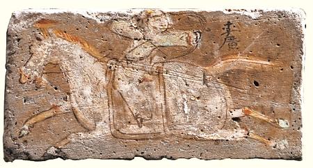 敦煌市博物館藏的西晉李廣射虎彩繪畫像磚表現(xiàn)的是“李廣射虎”的情景。李廣頭戴冠,八字須,著交領窄袖衣,系腰帶,下身著裈,騎于疾奔的馬上返身張弓待發(fā)。李廣射虎的故事被記載于司馬遷《史記》中,原文是:“廣出獵,見草中石,以為虎而射之,中石沒鏃,視之石也。因復更射之,終不能復入石矣。廣所居郡聞有虎,嘗自射之。及居右北平射虎,虎騰傷廣,廣亦竟射殺之。”