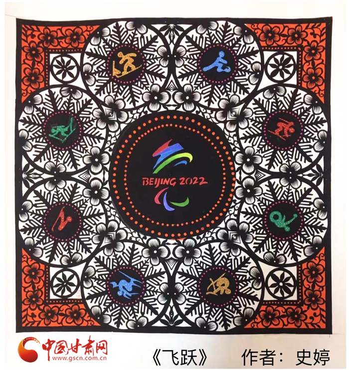 “剪紙是中國(guó)傳統(tǒng)文化,也是我的特長(zhǎng),所以我就用剪紙的形式創(chuàng)作了這兩幅《冬夢(mèng)》《飛躍》”。時(shí)值冬奧會(huì)在北京盛大開(kāi)幕,史婷以冬奧會(huì)和冬殘奧會(huì)的會(huì)微為主題,加上一些比賽項(xiàng)目的標(biāo)志,創(chuàng)作了兩幅剪紙藝術(shù)作品。“我想通過(guò)作品為奧運(yùn)健兒們加油助力,希望他們?cè)诒荣愔心苋〉酶玫某煽?jī)。”她說(shuō)。