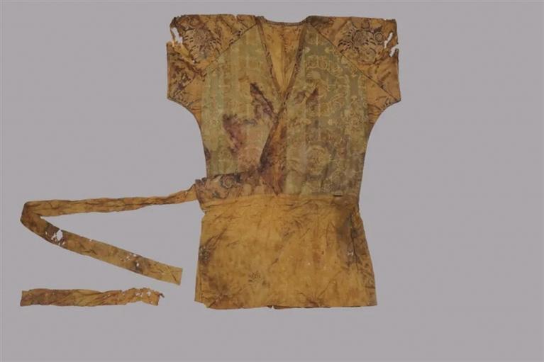 而在墓葬清理過程中,項目組經(jīng)清理確認慕容氏墓棺木保存完整,棺內(nèi)見人骨一具,仰身直肢。墓主身著唐朝官服,頭枕雞鳴枕,挽髻,戴巾子并簪金釵,頭套金質(zhì)下頜托,面罩絲織覆面,腰束嵌金蹀躞帶,身前放置象牙笏板,蓋絲質(zhì)衾褥,身旁放置有盤、碗、碟、筷、勺、胡瓶等餐飲器具;筆、墨、紙、硯等文房用具;漆奩、鏡衣、粉盒、骨笄、木梳等梳妝用具;嵌金匕首、豹皮弓韜、貼金花漆木胡祿等武器裝備。墓主身著絲織衣物多達十四層,其內(nèi)包括絹、綺、綾、錦、羅、紗、緙絲等傳統(tǒng)絲織品種類兼?zhèn)?;團窠紋、對獅紋、翼馬紋、對鹿紋、鳳紋、麒麟紋等唐代絲織品紋樣兼?zhèn)?;夾纈、扎染、刺繡等唐代絲織品制作工藝兼?zhèn)?,為國?nèi)外所罕見。