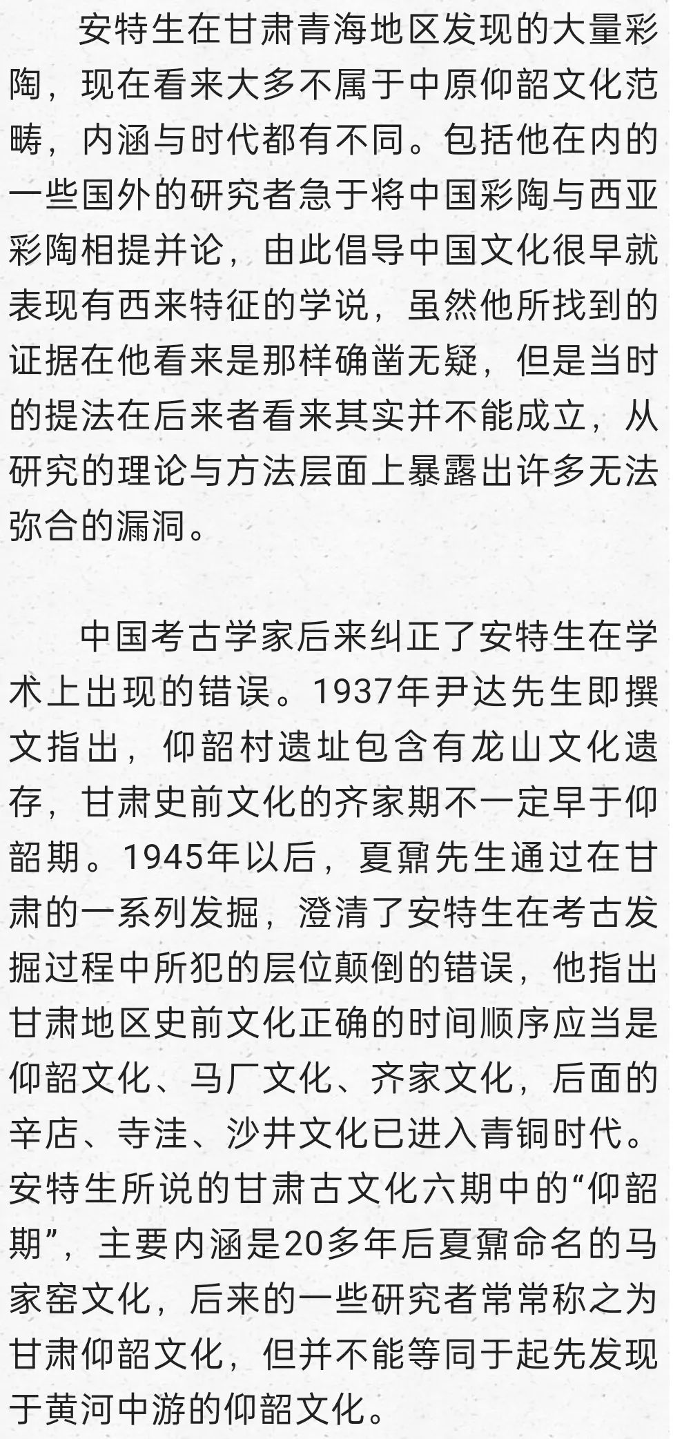 安特生從1923年開(kāi)始沿黃河西行,去追溯仰韶文化和彩陶文化的源頭。他在甘肅和青海一帶發(fā)現(xiàn)了豐富的古文化遺存,發(fā)現(xiàn)了比中原數(shù)量更多的彩陶,這使得他流連忘返,一直在那里待了近兩個(gè)年頭。安特生發(fā)現(xiàn)六種考古學(xué)文化中都見(jiàn)到了彩陶,他認(rèn)為這些考古學(xué)文化處于新石器時(shí)代晚期到向青銅時(shí)代過(guò)渡的時(shí)期,絕對(duì)年代約在公元前3500年到1500年之間,包括仰韶在內(nèi)它們代表了6個(gè)發(fā)展階段,它們是齊家期、仰韶期、馬廠期、辛店期、寺洼期和沙井期,這便是他創(chuàng)建的“六期說(shuō)”。將齊家期放在仰韶期之前,齊家期簡(jiǎn)單而質(zhì)樸的彩陶紋飾,被認(rèn)定是彩陶開(kāi)始出現(xiàn)的證據(jù)。