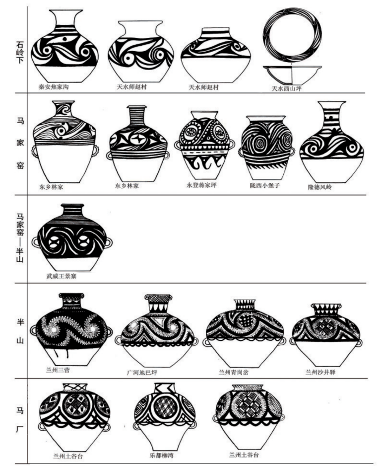 在20世紀(jì)五六十年代,在甘肅及鄰近的青海東部地區(qū)新發(fā)現(xiàn)大量的馬家窯文化遺址,同時(shí)也進(jìn)行了一些發(fā)掘工作,為探索馬家窯文化及彩陶的來(lái)源進(jìn)行了深入研究。關(guān)于馬家窯文化與仰韶文化的關(guān)系,體現(xiàn)在彩陶上的線索非常明確,石興邦先生就此進(jìn)行了探討,他在1962年發(fā)表的一文中認(rèn)為馬家窯文化彩陶受到廟底溝類(lèi)型彩陶的影響,紋飾母題與演變規(guī)律都有相似之處。嚴(yán)文明先生1978年發(fā)表的《甘肅彩陶的源流》,論及半坡類(lèi)型向隴東和廟底溝類(lèi)型向隴西及青海東部的擴(kuò)展,認(rèn)為馬家窯文化彩陶的源起與中原地區(qū)的仰韶文化有關(guān)。