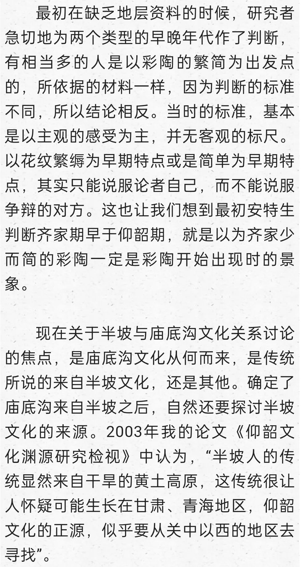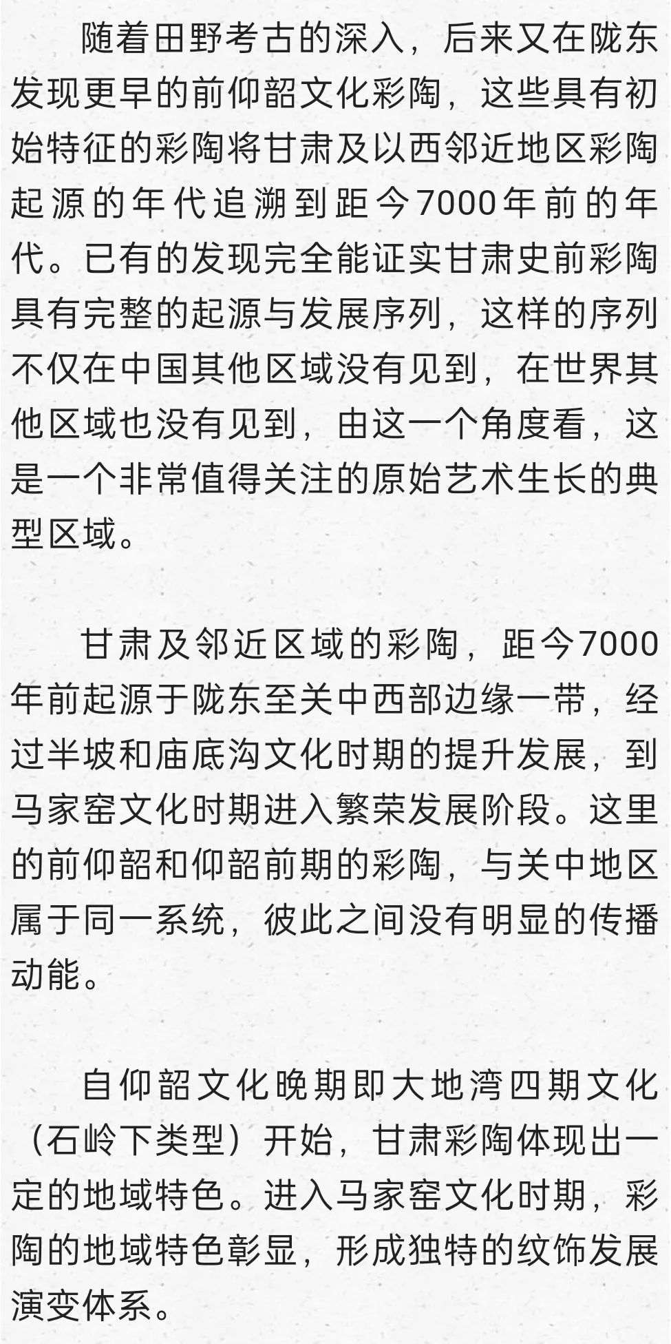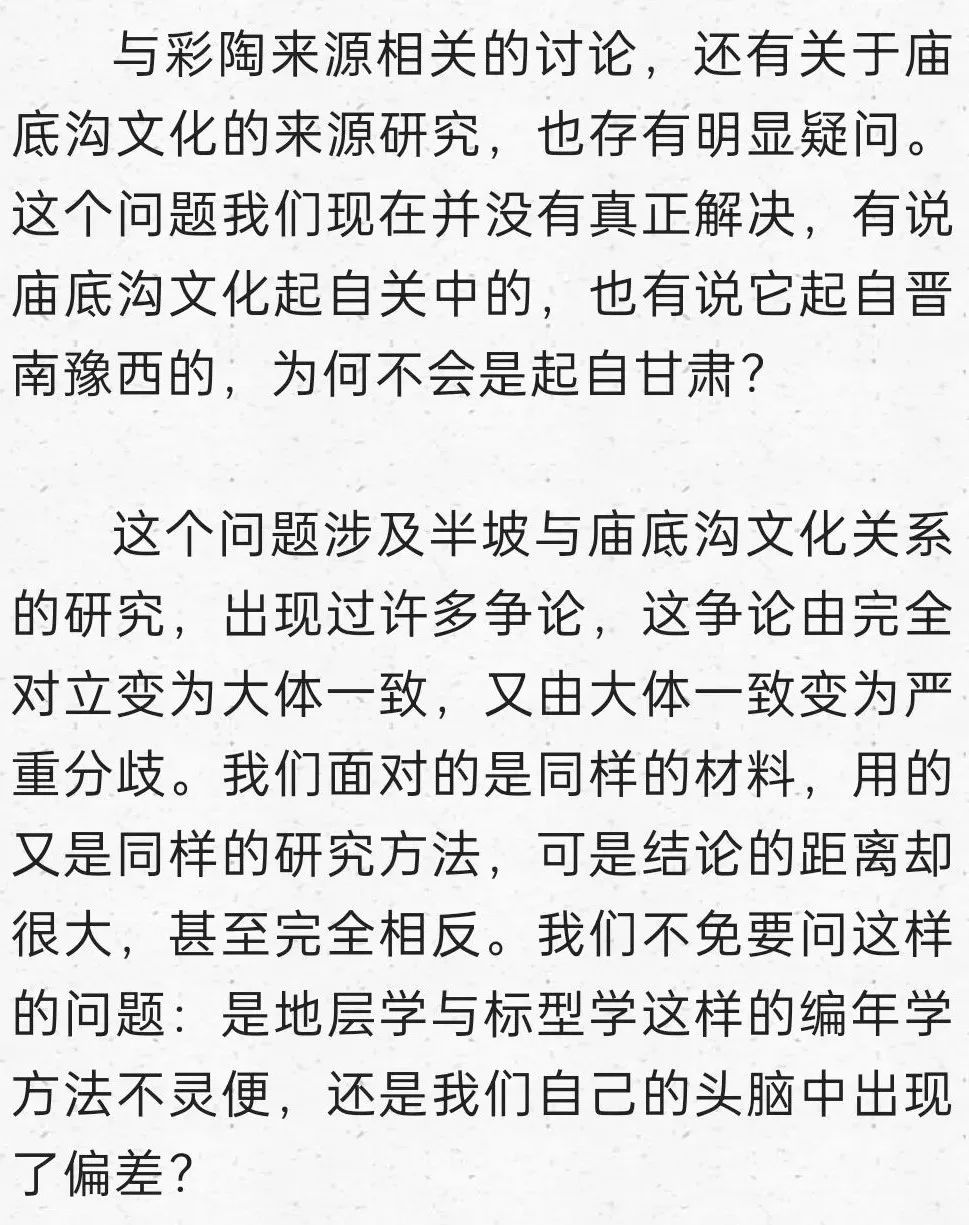 在這里明確提出到甘青尋找仰韶文化的正源,后來(lái)我又寫(xiě)成《秦安大地灣遺址彩陶研究》,討論甘青彩陶的序列,也表達(dá)了類(lèi)似觀點(diǎn):“甘肅及青海東部地區(qū)在距今6000年前左右,就已經(jīng)是仰韶文化的分布區(qū)域,馬家窯文化彩陶的來(lái)源應(yīng)當(dāng)就在這個(gè)本土區(qū)域,應(yīng)當(dāng)就是仰韶時(shí)期的廟底溝文化。從文化的分布與地層堆積關(guān)系找到了甘肅地區(qū)考古學(xué)文化明確的傳承關(guān)系,由彩陶紋飾演變的考察也能尋找到傳承的脈絡(luò)”。