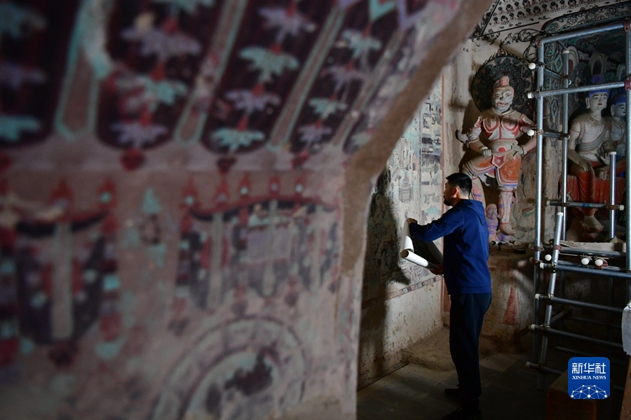 4月19日,在莫高窟第231窟,楊金禮在修復出現(xiàn)病害的壁畫。新華社記者 杜哲宇 攝
