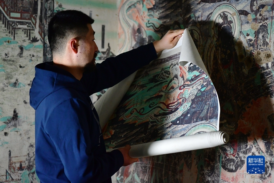 4月19日,在莫高窟第172窟,劉小同在對比臨摹壁畫的細節(jié)。新華社記者 杜哲宇 攝