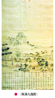 “隴溪九逸”每逢集會(huì),必懸此圖。他們繼承中國(guó)文人優(yōu)良的傳統(tǒng)美德,“居廟堂之高則憂其民,處江湖之遠(yuǎn)則憂其君”,看似醉情山水,實(shí)則壯心不已,制訂鄉(xiāng)約,設(shè)館授徒,為家鄉(xiāng)的文化教育事業(yè)發(fā)揮著余熱。從這個(gè)意義上說,明代秦安“隴溪九逸”正是古代知識(shí)分子憂國(guó)憂民的一個(gè)縮影,亦是那個(gè)時(shí)代的一抹春色。
