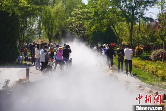 5月16日,甘肅蘭州,寓言故事園化身“瑤池”仙境美景,吸引不少市民前來觀賞、拍照。