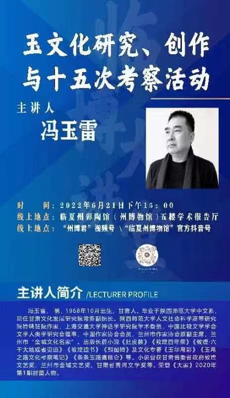 為認真貫徹落實省第十四次黨代會精神,進一步弘揚中國玉文化和民族精神,推動玉文化傳承及玉文化文創(chuàng)產(chǎn)業(yè)發(fā)展。6月21日下午,甘肅文化發(fā)展研究院常務副院長馮玉雷受邀在臨夏州彩陶館(州博物館)學術(shù)報告廳作了題為《玉文化研究、創(chuàng)作與十五次考察活動》的學術(shù)講座。
