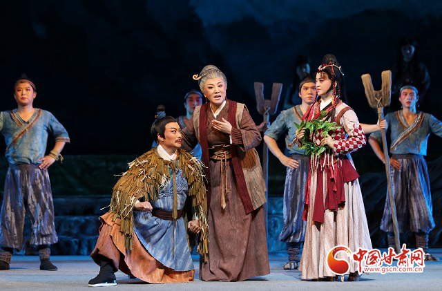 隴劇《大禹治水》是在甘肅省文化和旅游廳全程指導(dǎo)下,《黃河流域生態(tài)保護(hù)和高質(zhì)量發(fā)展規(guī)劃綱要》出臺之際,甘肅文藝工作者挖掘黃河文化蘊含的時代價值,講好“黃河故事”,實施隴原文藝高峰攀登工程、加強(qiáng)非物質(zhì)文化遺產(chǎn)保護(hù)傳承的具體行動。該劇將“大禹”這個上古英雄請下神壇,為他賦予了親情、愛情、家國情懷,在兩個小時的演出中,領(lǐng)銜出演“大禹”的優(yōu)秀青年演員邵炳德與雷通霞、竇鳳霞、佟紅梅等“三朵梅花”同臺飆戲,火花四濺的“開山”、扣人心弦“治水”,將大禹和先民們不畏艱險、篳路藍(lán)縷的開拓精神和奮斗精神,演繹得淋漓盡致,深深震撼著現(xiàn)場觀眾。而隴劇音樂獨有的“麻簧”、以皮影戲為表現(xiàn)手法的“月下婚禮”場景、水袖舞場景,把人物的情緒表現(xiàn)得栩栩如生,將獨具特色的隴劇藝術(shù)盡情綻放在舞臺之上。