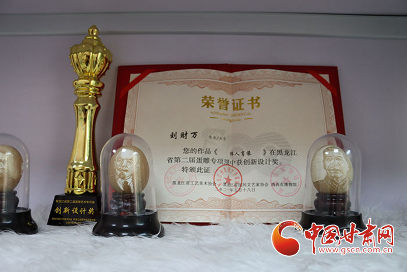 記者在采訪中注意到,社區(qū)的展柜一角擺放著不少獲獎(jiǎng)證書(shū),其中一張是在2021年的全國(guó)蛋雕專項(xiàng)展上,為劉財(cái)萬(wàn)作品《偉人肖像》頒發(fā)的創(chuàng)新設(shè)計(jì)獎(jiǎng)證書(shū)。“目前正在為全國(guó)蛋雕藝術(shù)聯(lián)展作準(zhǔn)備”,當(dāng)記者問(wèn)起下一步打算時(shí),劉財(cái)萬(wàn)顯得信心十足。