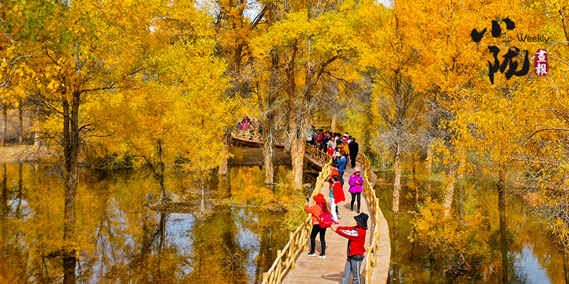 漫步林中,就仿佛進(jìn)入神話中的仙境。茂密的胡楊干奇百怪,神態(tài)萬般。粗壯、滄桑的胡楊幾個(gè)人難以合抱,挺拔的有七八丈之高,怪異的似蒼龍騰越、虬蟠狂舞。每一棵高大的樹冠枝頭,間或又有淺綠、淡黃的葉片在閃現(xiàn),錯(cuò)落有致,色彩繽紛,滿眼的赤橙黃綠與盈盈秋水互相映襯,令人嘆為觀止?!?/p>