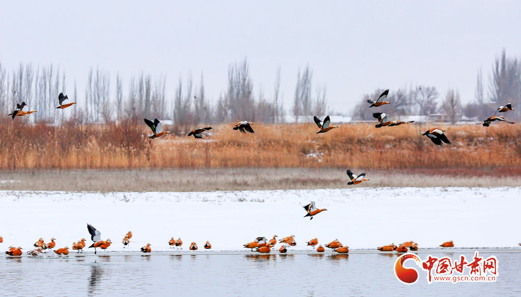 12月20日,在甘肅省酒泉市銀達鎮(zhèn)花園水庫,一群候鳥正在戲水、覓食,為祁連山下的戈壁大地增添了一道亮麗的景色。