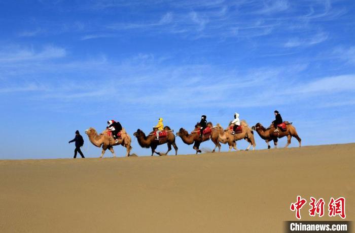 1月27日,游客騎駱駝暢游敦煌鳴沙山。張曉亮 攝