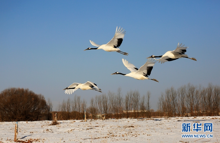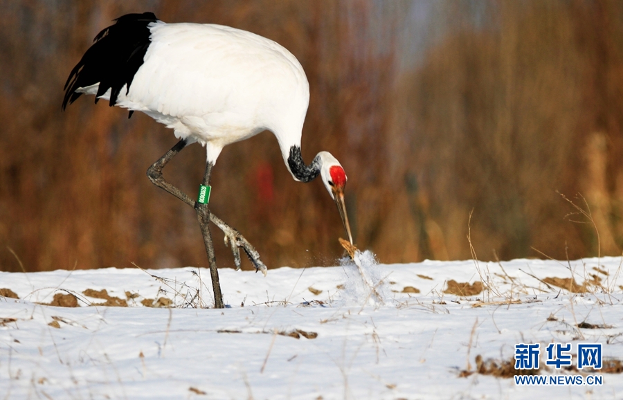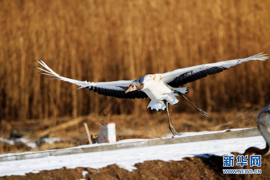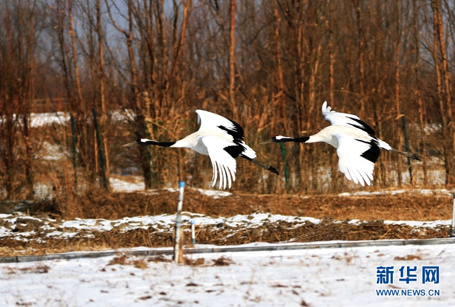 2月14日,雪后初晴,甘肅省張掖國家濕地公園放飛的十余只丹頂鶴翩翩起舞、嬉戲覓食,使雪后的濕地公園充滿生機。新華網(wǎng)發(fā)(陳禮 攝)