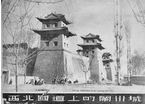 特別難得的是,他拍下了一張?zhí)m州城樓的照片,這是筆者見過的所有蘭州城樓中最壯觀的。照片上,中間的城門和兩個(gè)角樓并行排列,角樓前面是幾株西北地區(qū)常見的高聳挺拔的白楊樹,角樓底下是幾個(gè)正在等客人的黃包車夫。這座城樓是蘭州東郭城門迎恩門,俗稱東稍門(位于今東方紅廣場(chǎng)東口什字),中間有城門洞,南北兩側(cè)為角樓,無城門洞。