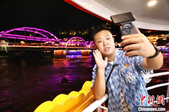 7月16日,“絲路風(fēng)采 如意甘肅”海峽兩岸記者聯(lián)合采訪活動在甘肅蘭州啟動。圖為臺灣自媒體人林惟綱在“黃河第一橋”——中山橋下拍攝短視頻?!≈行律缬浾?nbsp;李雪峰 攝