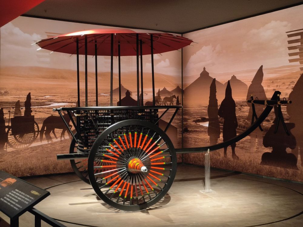 這些車輿依據(jù)張家川縣馬家塬遺址出土的車輛遺跡復(fù)制。馬家塬遺址是一處戰(zhàn)國晚期的西戎貴族墓地,共出土車輛遺跡69輛,隨葬品3600多件(套),2021年入選中國“百年百大考古發(fā)現(xiàn)”。