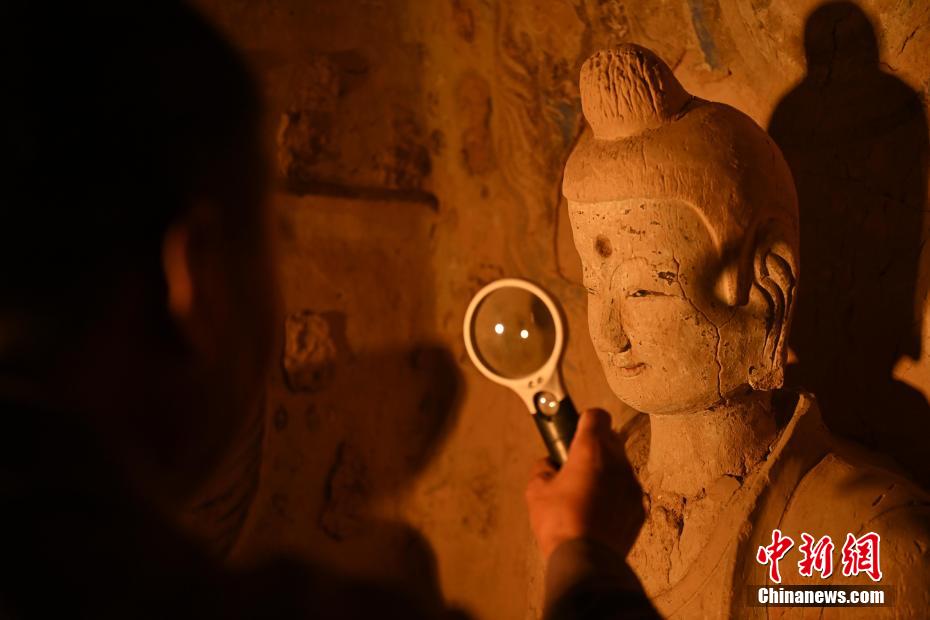 有時候看似簡單的佛像修復(fù)會遇到各類不同的文物病害,修復(fù)時間會長達三年之久,他也見證了文物修復(fù)技藝的變遷。隨著科技進步文物修復(fù)手段也變得越來越先進,他認(rèn)為未來的文物保護工作一定會越來越好,年輕文保工作者們也一定會想盡更多辦法留住這座世界文化遺產(chǎn)。圖為8月25日,文物修復(fù)師牟常有正在仔細(xì)觀察佛像表面出現(xiàn)的病害問題。李亞龍 攝