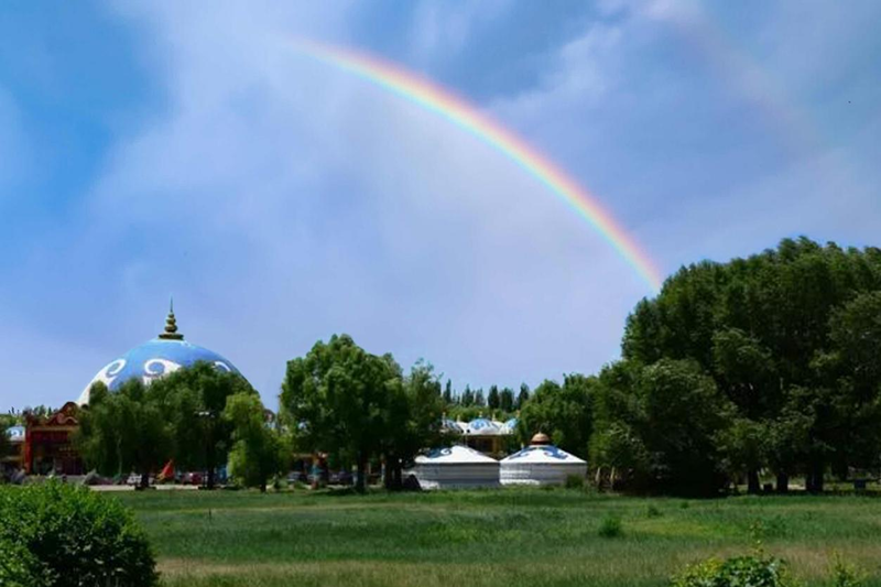 余每遙望心儀卻不能至的彩虹,常憶陸游《秋思》詩句:“天際掛虹初斷雨,云頭翳日又成陰。”秋游包頭賽汗塔拉(1),卻出人意料地邂逅可望亦可即的彩虹。經當地友人引領乘興疾步入彩虹落腳處,大異既往定見,歸作以志其趣。