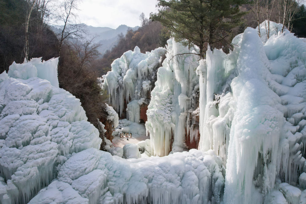 這是1月17日拍攝的渭源縣天井峽西部雪谷內(nèi)的冰瀑景象(無(wú)人機(jī)照片)。新華社記者 張智敏 攝