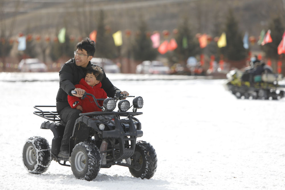 1月16日,在渭源縣田家河鄉(xiāng)元古堆村冰雪樂(lè)園,游客在體驗(yàn)雪地摩托。新華社記者 方欣 攝