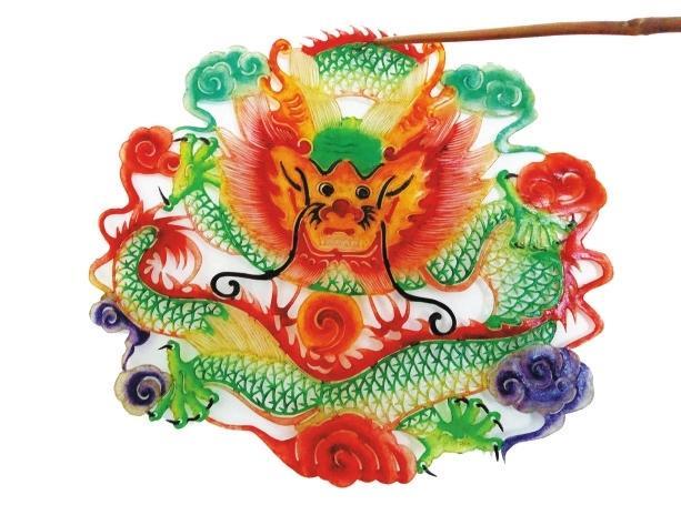 國家級非物質(zhì)文化遺產(chǎn)項(xiàng)目——皮影戲(環(huán)縣道情皮影戲)代表性傳承人高清旺,以當(dāng)?shù)剜l(xiāng)土風(fēng)情為素材,選用優(yōu)質(zhì)牛皮,經(jīng)過炮制牛皮、畫好樣稿、陰陽雕刻、顏料上色、燙熨出水、裝訂完成等雕刻工藝流程,制作成了龍年大吉圖案。