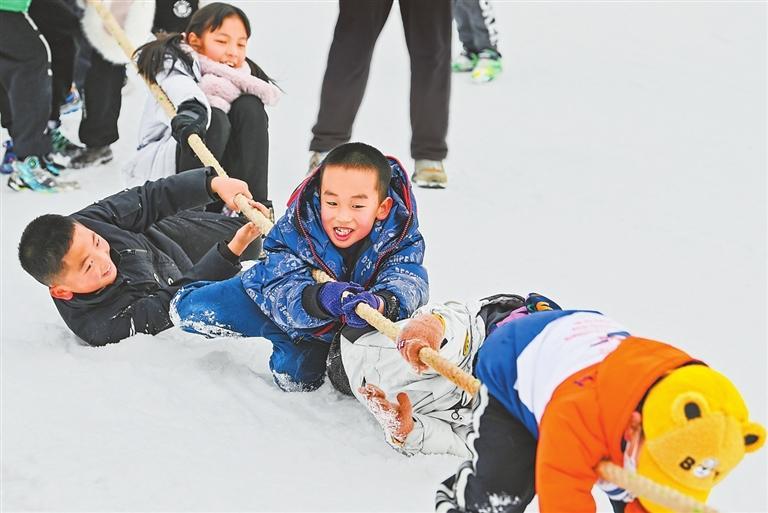 游客在雪地上拔河。