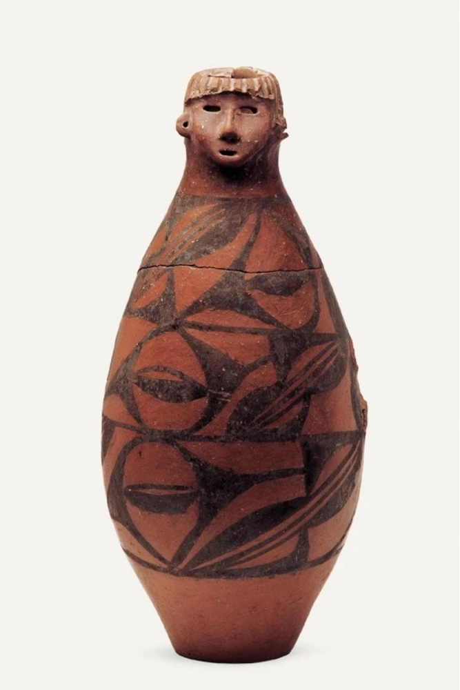隴東少女作為甘肅的“顯眼包”之一,是曾在《國家寶藏》中出現(xiàn)過的“網(wǎng)紅”、甘肅省博物館鎮(zhèn)館之寶,它于1973年從秦安縣大地灣遺址出土。具有高度審美能力的“托尼”老師,設計了齊劉海發(fā)型,顯得很泰酷辣,圓鼓腹、平底,人們細看發(fā)現(xiàn),陶人的兩眼為圓孔洞,顯得目光深邃;鼻子呈蒜頭形,雕有鼻孔;嘴較小,微微張開,好像正在言語;兩耳外展,皆有穿孔;瓶體從上至下以黑彩飾三層大小相同、由弧線三角紋和斜線組成的二方連續(xù)圖案,以示華麗的衣物。另外,陶瓶人頭像的器口運用了不同的制作手法,頭發(fā)、嘴系雕刻而成,鼻、臉是捏塑而成。人頭像五官整齊、面龐秀麗,器身造型典雅,與人物形象渾然一體,既是大地灣文化彩陶的代表作,也是中國史前集彩繪、雕塑與造型藝術于一身的杰作。估計任誰看一眼,都會被“她”的神秘和美麗所吸引吧。