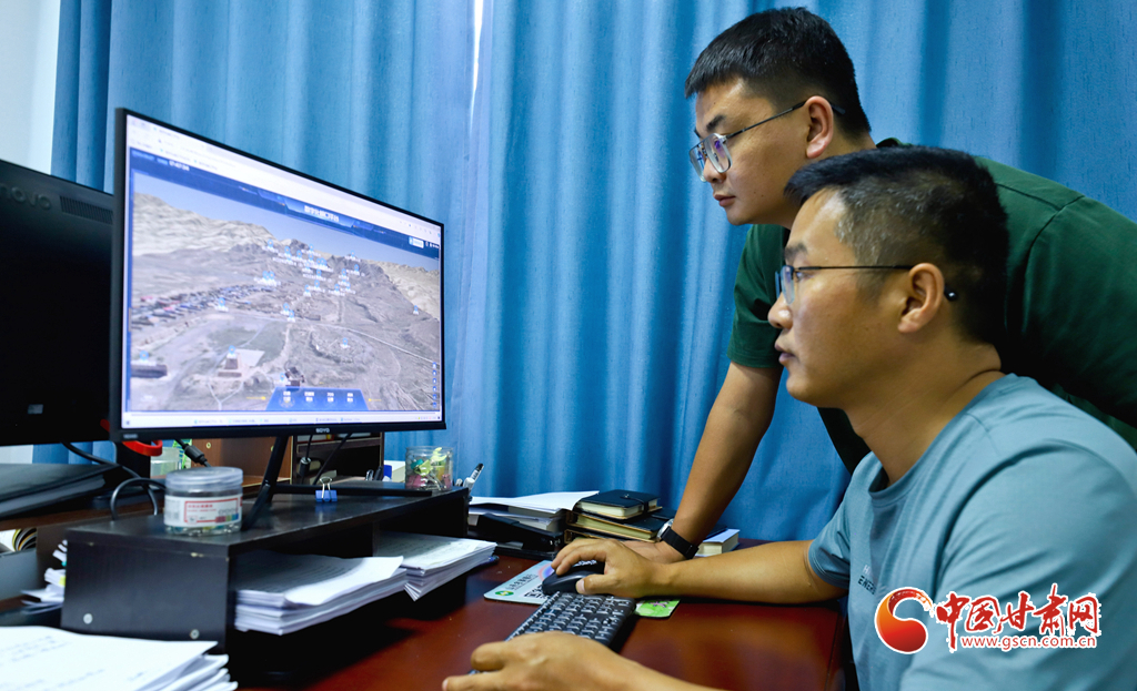 6月27日,甘肅省張掖市山丹縣漢明長(zhǎng)城保護(hù)研究中心工作人員正在三維數(shù)字化平臺(tái)進(jìn)行長(zhǎng)城和烽火臺(tái)的數(shù)據(jù)測(cè)量。