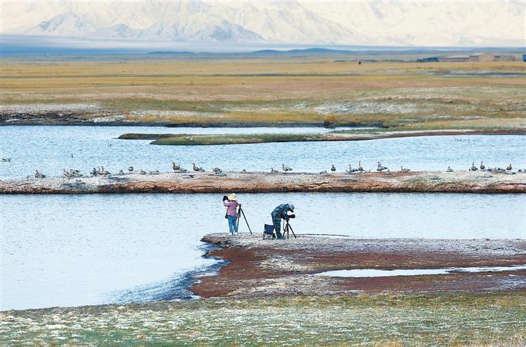 夏日的甘肅鹽池灣國(guó)家級(jí)自然保護(hù)區(qū)雪山巍峨,景色壯美。一群藏野驢時(shí)而追逐奔馳,時(shí)而悠閑覓食;大批北歸遷徙的候鳥自由翱翔,盡顯大自然的和諧之美。