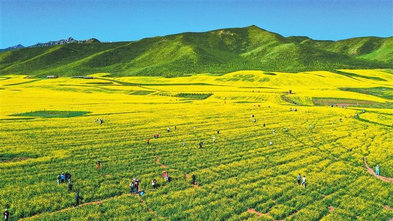 一路前行,一路風(fēng)景。一片片的油菜花開得生機(jī)勃勃,連天接地,引得游人駐足拍照。萬畝油菜花海隨風(fēng)起伏,如同時間長河里濺起的金色浪花,游人穿行于花海中,臉上都露出了孩子般的笑容,愜意而放松……