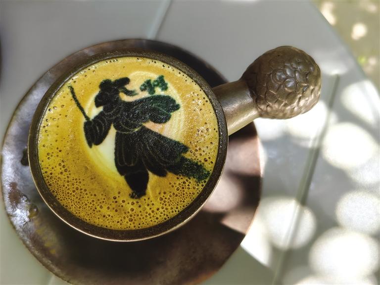 驚喜還有很多,就像店內(nèi)柜體上的一句話“可以讓大家體會(huì)到我們不一樣的用心”,這些年輕人用心起來(lái)還真能撬動(dòng)地球。飲品和咖啡,設(shè)計(jì)團(tuán)隊(duì)愣是把口味和地域文化結(jié)合起來(lái),整出了幾款“限量版”:城市限定——沙橙暴飲品,西北特有;特調(diào)咖啡——苦水玫瑰特調(diào),讓人一口難忘之余還配上了臺(tái)詞,“苦水玫瑰有點(diǎn)甜”;“文物咖啡”更是占據(jù)“C位”,咖啡拉花機(jī)“印制”而成的微縮版銅奔馬、蛙紋罐、銅車(chē)馬等文物圖案浮在濃郁的咖啡上,精致、唯美。這還不算,咖啡器皿的名稱(chēng)也非同尋常——鷹首權(quán)杖杯。陶瓷來(lái)自景德鎮(zhèn),手柄是省博鷹頭形青銅權(quán)杖首的文物原型。驚嘆、贊美、感慨,每一位品嘗之人喜愛(ài)之余竟不忍飲用。
