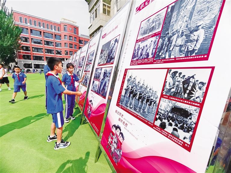 活動現(xiàn)場,該館講解員給孩子們講述了《抗戰(zhàn)烽火中的少年兒童》及《英雄血灑黃河畔——叢德滋》紅色故事。之后,蘭州市口琴藝術(shù)交流學(xué)會的成員現(xiàn)場演奏了《沒有共產(chǎn)黨就沒有新中國》《游擊隊之歌》《中國少年先鋒隊隊歌》等經(jīng)典紅色曲目。圖為學(xué)生觀看展板。