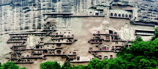在天水市區(qū)東南40余公里的茫茫西秦嶺林海之間,一座酷似民間麥垛的孤峰突兀而起。沿懸崖絕壁上凌空環(huán)繞的棧道迂回盤(pán)行,一座座懸空開(kāi)鑿的洞窟中,供奉著數(shù)以千計(jì)、千姿百態(tài)的佛像。孤峰四周林海蒼茫、群山疊翠,洞窟內(nèi)泥塑佛像、精美壁畫(huà),交相輝映,令人嘆為觀止。