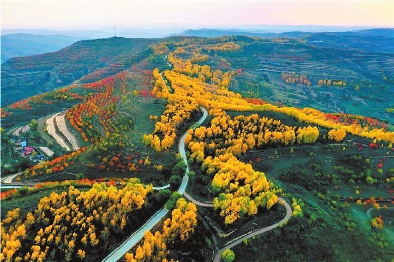 金秋時節(jié),這里秋葉五彩繽紛,黃得如金,綠得如玉,紅得如火,把秋姑娘打扮得格外妖嬈。一陣涼風(fēng)拂過,金黃的樹葉,搖曳著一把把小扇子,從空中飄飄而下,似乎在訴說著一個美麗的童話。村落散落在綿延數(shù)里的山腳下,村前屋后金色圍繞,梯田如鏈似帶、穿插交錯,如一幅幅線條簡潔明快的木刻版畫。