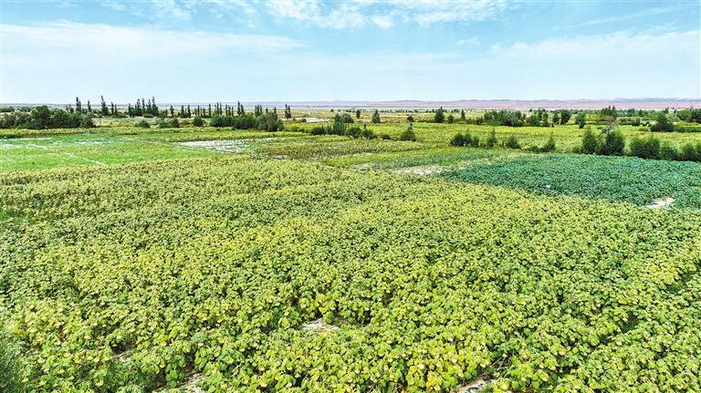 金塔縣航天鎮(zhèn)營盤村重度鹽堿耕地綜合治理利用核心示范點綠意盎然,向日葵、蓖麻、高粱等作物長勢喜人。